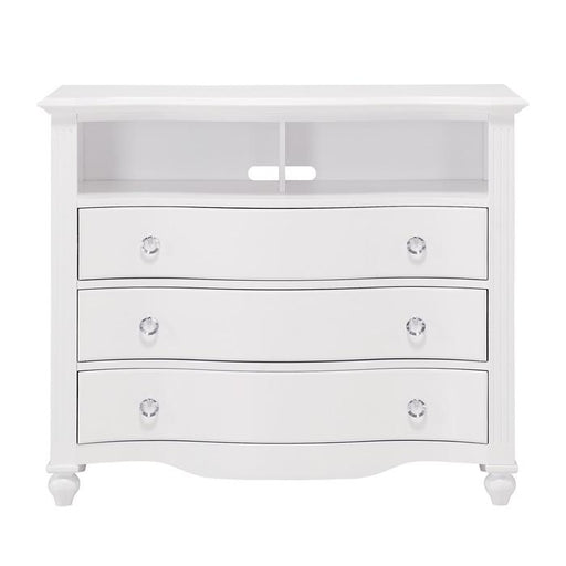 Meghan Collection by Homelegance Whitefinish 3 Drawers 2 Storage cubbies Made of manmade wood and wood Dovetail drawers Ball bearing glides Polish...