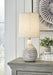 Shine a contemporary spotlight on your good taste with this table lamp. The antiqued white and goldtone finish of the metal lamp adds texture and interest to any space. With a modified drum shade, this light will illuminate your decor with style.