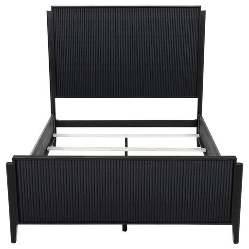 Augment your sophisticated bedroom with the addition of a modern two-drawer nightstand. It boasts a classic stance, with two drawers that offer a place for overnight essentials and personal necessities like books. The top drawer includes felt lining while half-moon pulls add metallic contrast with a soft golden hue. Drawer fronts are fluted, offering impressive texture and dimensionality at your bedside. Its black finish is wire brushed, adding the perfect touch of texture and depth. Key Features: • Stylish and modern, a contemporary wood nightstand features a wire brushed black finish • Fluted texturing highlights two drawer fronts to provide sophisticated dimensionality • Drawers feature demi-lune metal handles in a warm golden tone for sophisticated contrast • Top drawer includes felt lining in matching black, offering easy protection to delicate items • Tapering legs complete the look while offering stability and support • Drawers feature English dovetail joinery for excellent craftsmanship