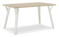 Bring light to your dining area with the clean lines and bright two-tone finish of this dining package. The round dining table, with stylized saber legs in a white finish, matches the spindle-back chairs for beautiful simplicity. The table’s melamine top, in a light tan color, provides additional durability, marrying minimalism with big style for a delightful combination.