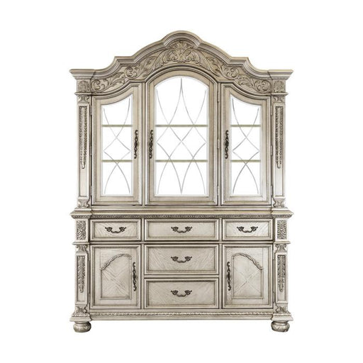 Bevelle Collection by Homelegance Furniture Silver finish Acrylic inset framing 2 Drawers 4 Doors Hutch features 3 doors Glass inserts on doors an...