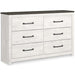 Cool, clean and casually modern. This dresser’s wispy whitewash and gray finish sets the tone for your calming sanctuary. Large linear pulls add dimension and authenticity. Six smooth-gliding drawers neatly accommodate your wardrobe needs.