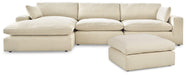 Down with uptown style. This sectional sofa and ottoman package goes to town with a high-design aesthetic, sleek sophistication and sumptuous comfort that are temptingly affordable. Wide track arms, softened by plush side pillows, offer a welcoming look and feel. The back pillows, seat cushions and ottoman top with fluffy feather fill bring added flair and indulgence. Best of all, the modular design lets you stage the pieces solo or group them in various configurations to suit your mood.