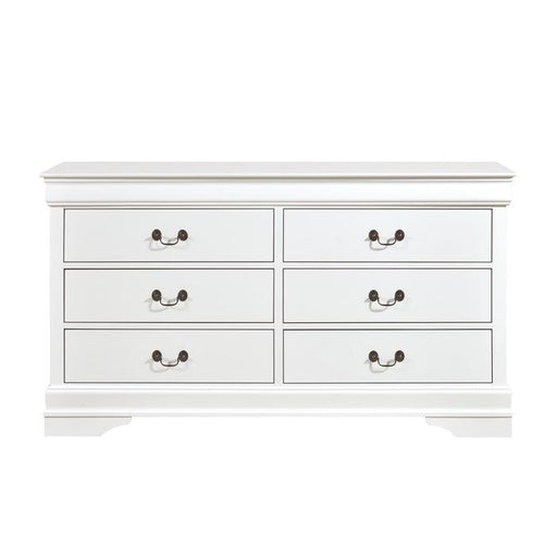 View full detailsLucida Collection by Homelegance White finiish Made of manmade wood Bead molding Shell motif 6 Drawers Dovetail drawers Metal on metal center glid...