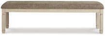 The beauty of this upholstered dining bench is something to savor. Serving up country cottage comfort and fresh farmhouse flair, the generously-scaled bench entices with a cushioned seat covered in a heavy woven fabric that complements the trendy textured, antiqued white finish.