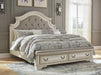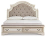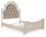 Elevating the art of traditional cottage styling, this queen upholstered bed is your dream bedroom retreat realized. A curvaceous beauty, this brilliant upholstered bed wows with dramatic scalloped details and fanciful trim work. The distressed chipped white finish charms with its heirloom appeal. Deep tufting on the cushioned upholstered headboard adds such a cozy element sure to put you at ease. Mattress and foundation/box spring available, sold separately.