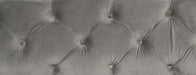 - Gray velvet-covered, rolled, padded headboard and footboard
